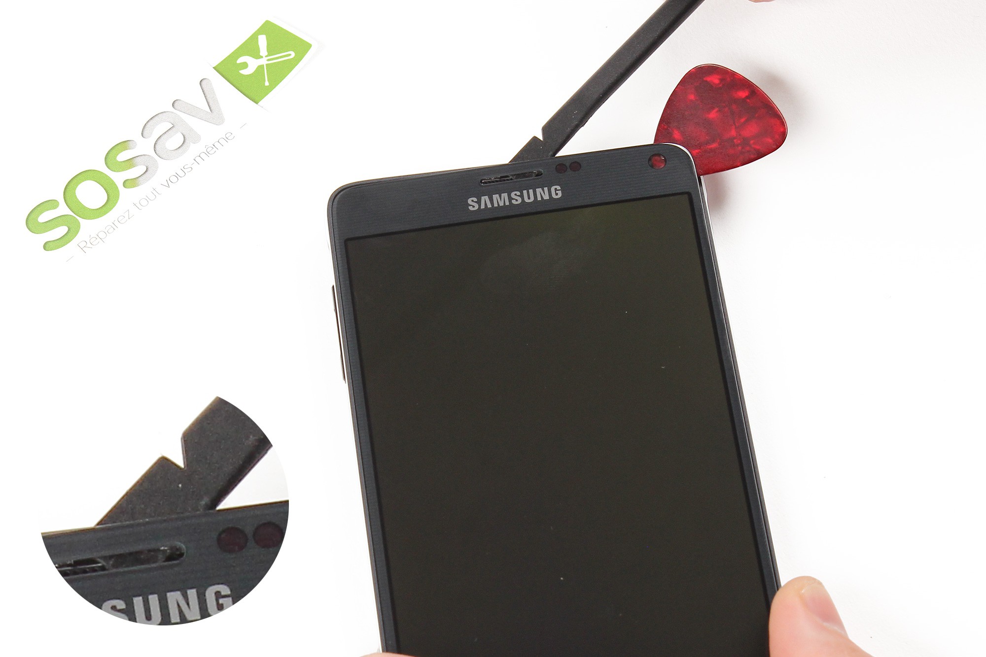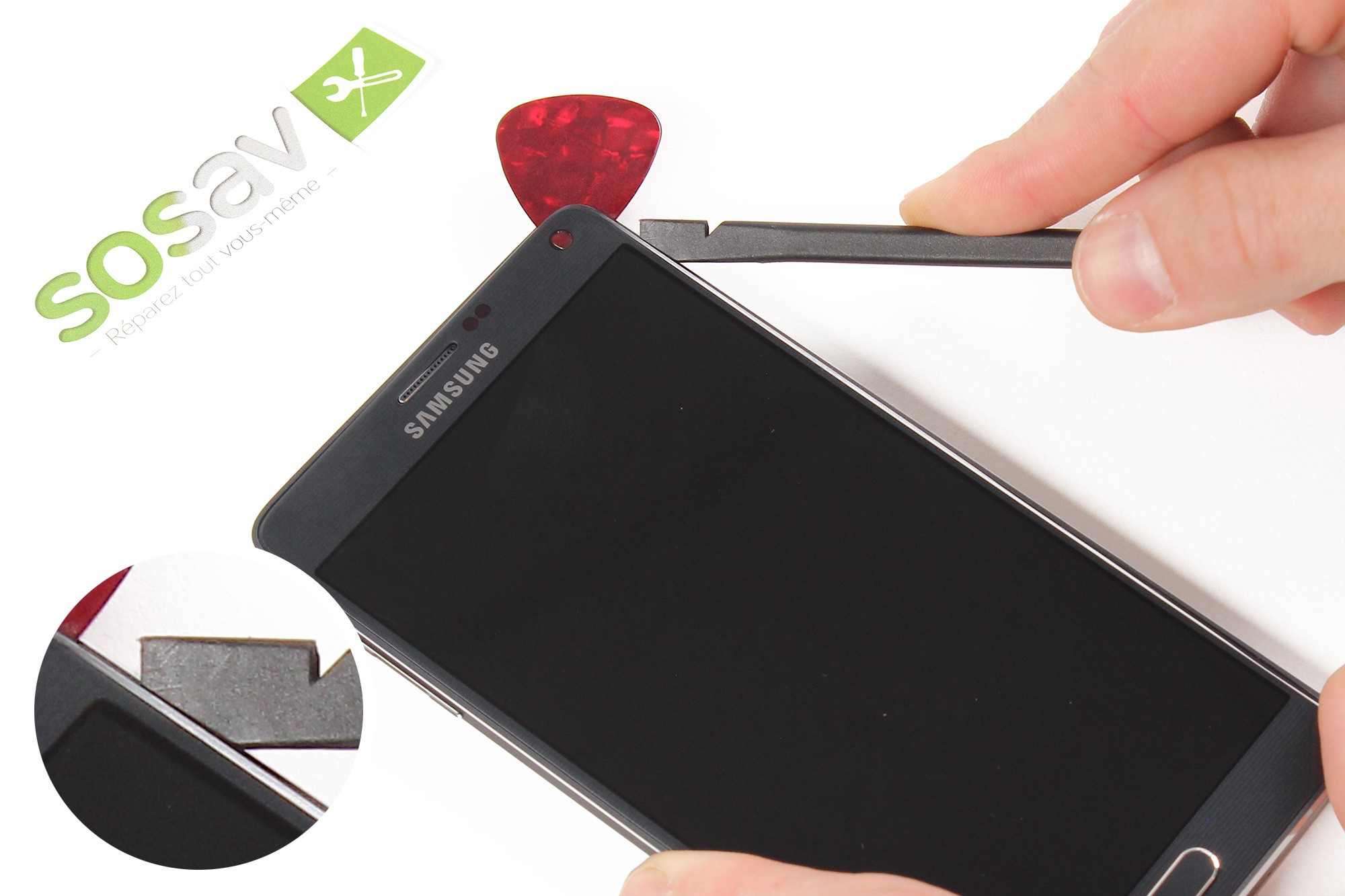 A l'aide d'une spatule en nylon, soulevez délicatement l'angle droit supérieur de la vitre.Insérez ensuite un médiator entre la vitre afin que cette dernière ne se recolle pas.