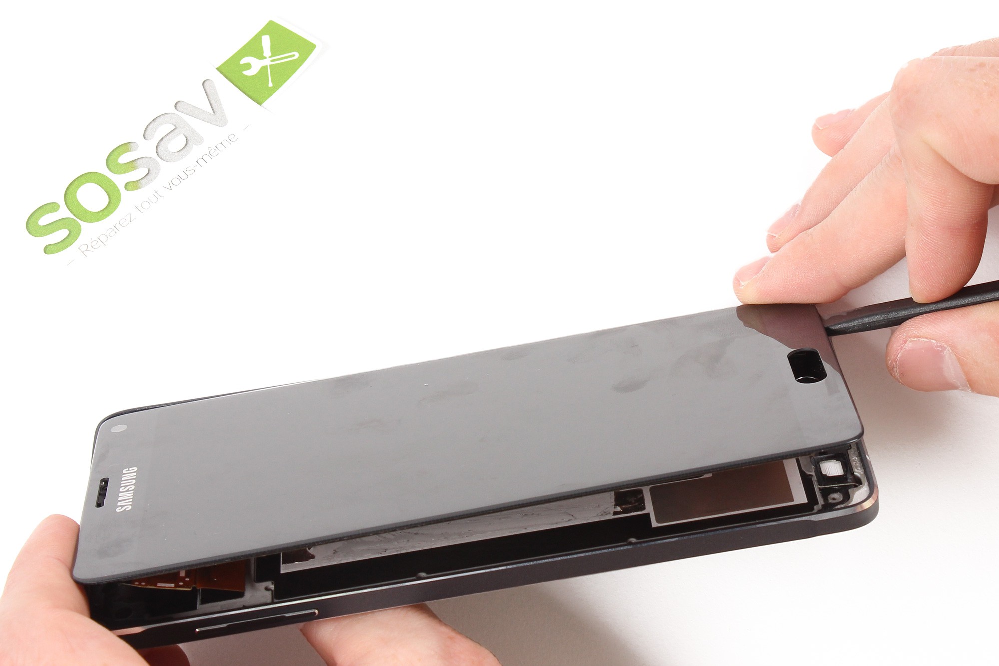 Attention aux nappes des boutons tactiles du bas de l'écran.Soulevez ensuite ce dernier par la partie basse, la nappe de l'écran se situant sur la partie supérieure.
