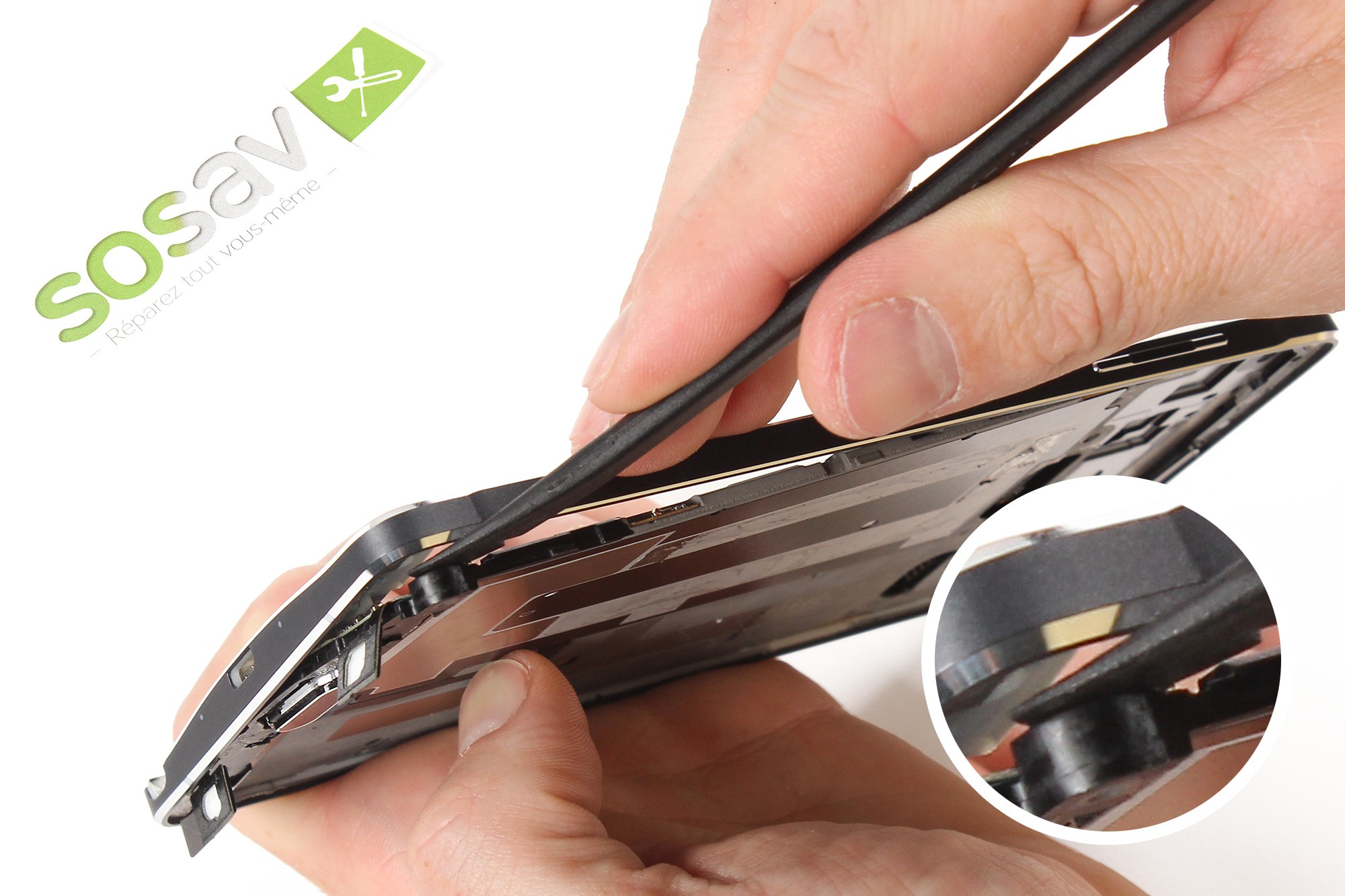 Toujours avec la spatule en nylon, déclipsez la partie haute du châssis interne puis procédez délicatement à son retrait.