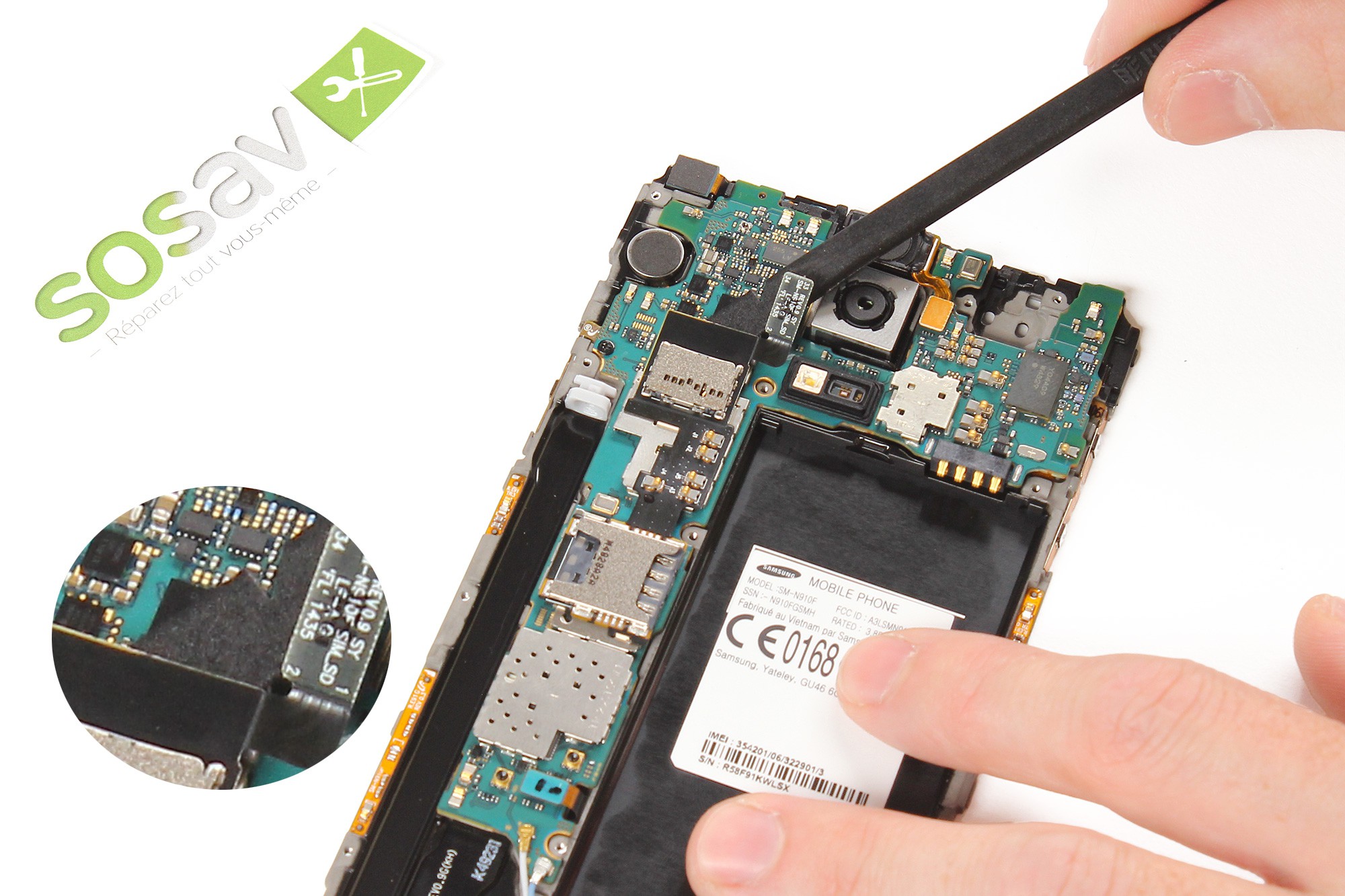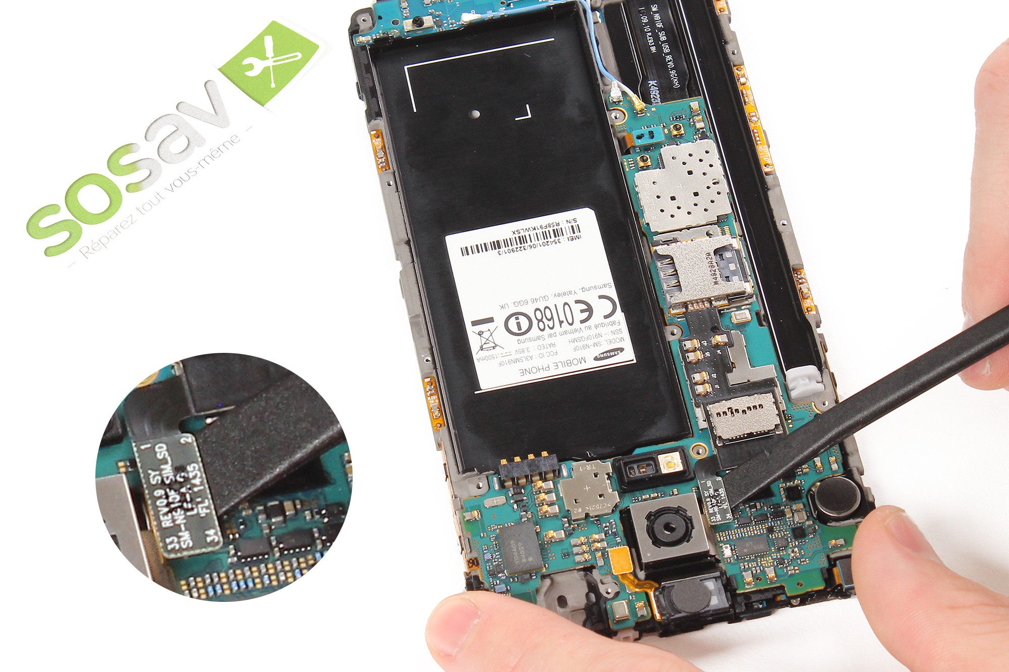 Décollez délicatement le lecteur SIM et MicroSD de la carte mère en vous aidant de la spatule en nylon.