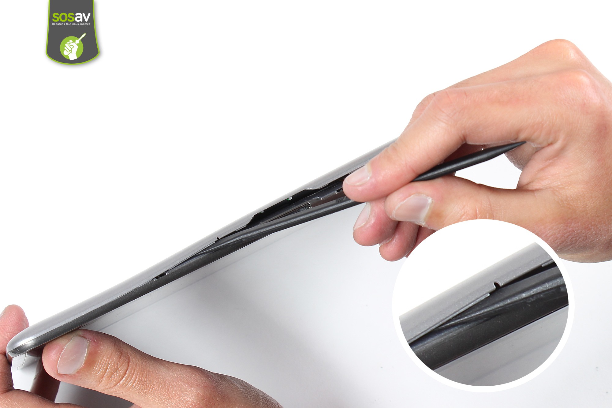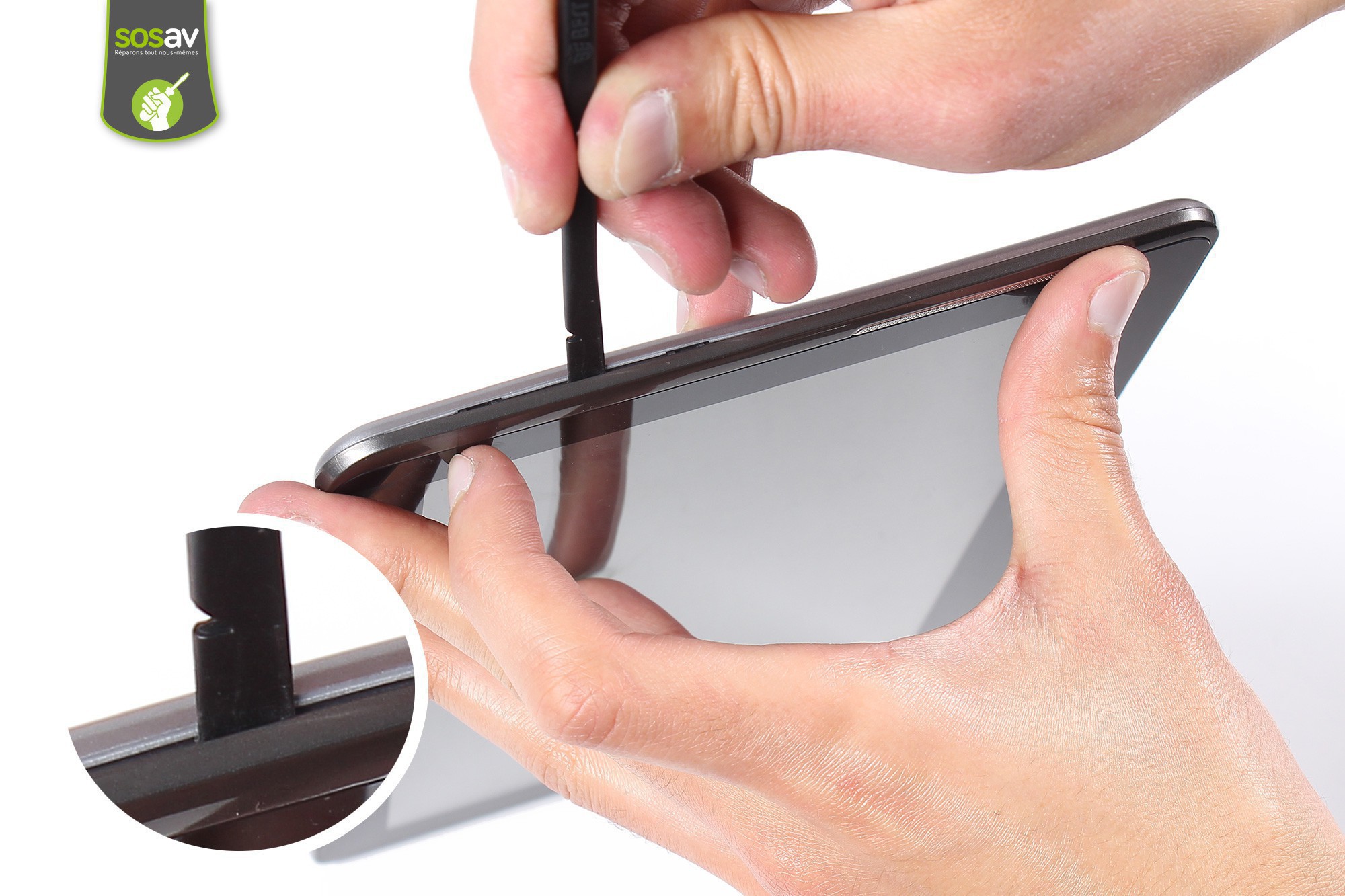 Toujours à l'aide de la spatule en nylon, déclipsez la partie située en bas à gauche de la tablette.