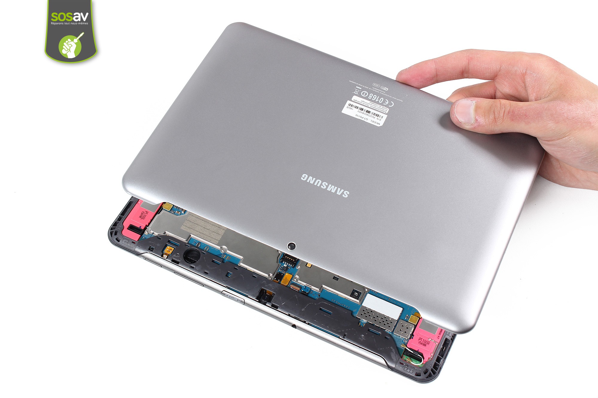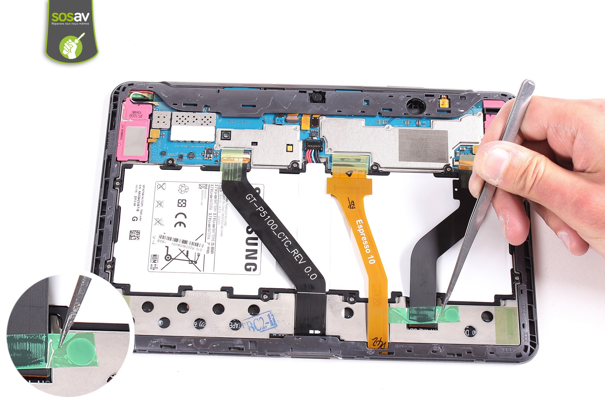 Soulevez ensuite délicatement la coque arrière de la tablette puis procédez à son retrait.La coque arrière de la Samsung Galaxy Tab 2 10.1" est désormais démontée.A l'aide d'une pince, saisissez l'adhesif vert puis décollez le légèrement afin de pouvoir accéder au connecteur de la nappe, côté carte mère.