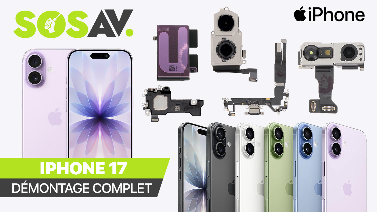 Comment se déroule la réparation de l'iPhone 17 ? Apple continue d'optimiser l'architecture interne pour faciliter l'accès aux composants. L'ouverture peut s'effectuer par l'avant (écran) ou par l'arrière (vitre), simplifiant grandement le remplacement de la batterie ou de la face arrière en cas de bris. Le remplacement de l'écran nécessite toutefois de la précision pour préserver les capteurs Face ID. En utilisant nos tutoriels détaillés, vous pourrez remplacer le bloc écran, la batterie ou les modules caméras. L'équipe technique de SOSav est là pour vous accompagner dans chaque étape de votre réparation.