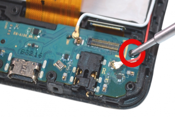 Glisse la pointe de la brucelles dans la fente indiquée par une flèche pour détacher le support de protection du connecteur de charge.