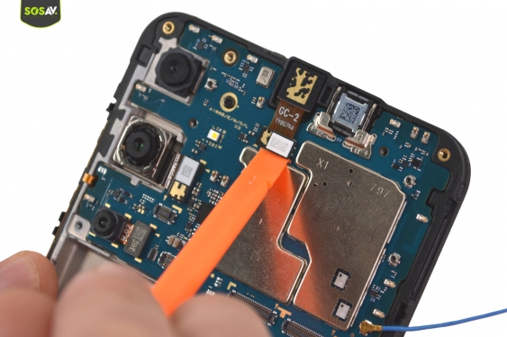 Débranchez la nappe du capteur d'empreintes avant d'introduire le médiator entre l'écran et le châssis intermédiaire pour le déclipser.