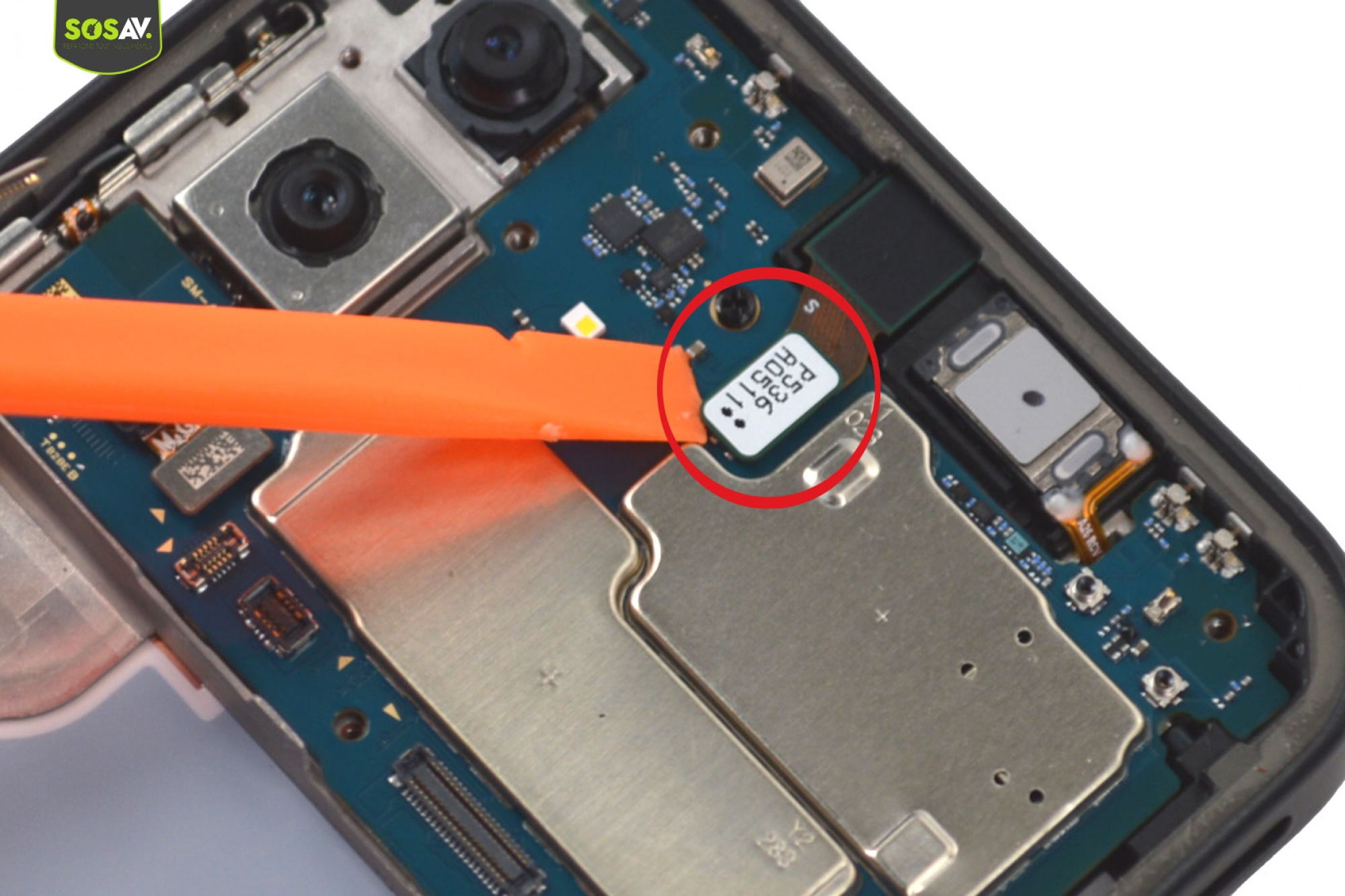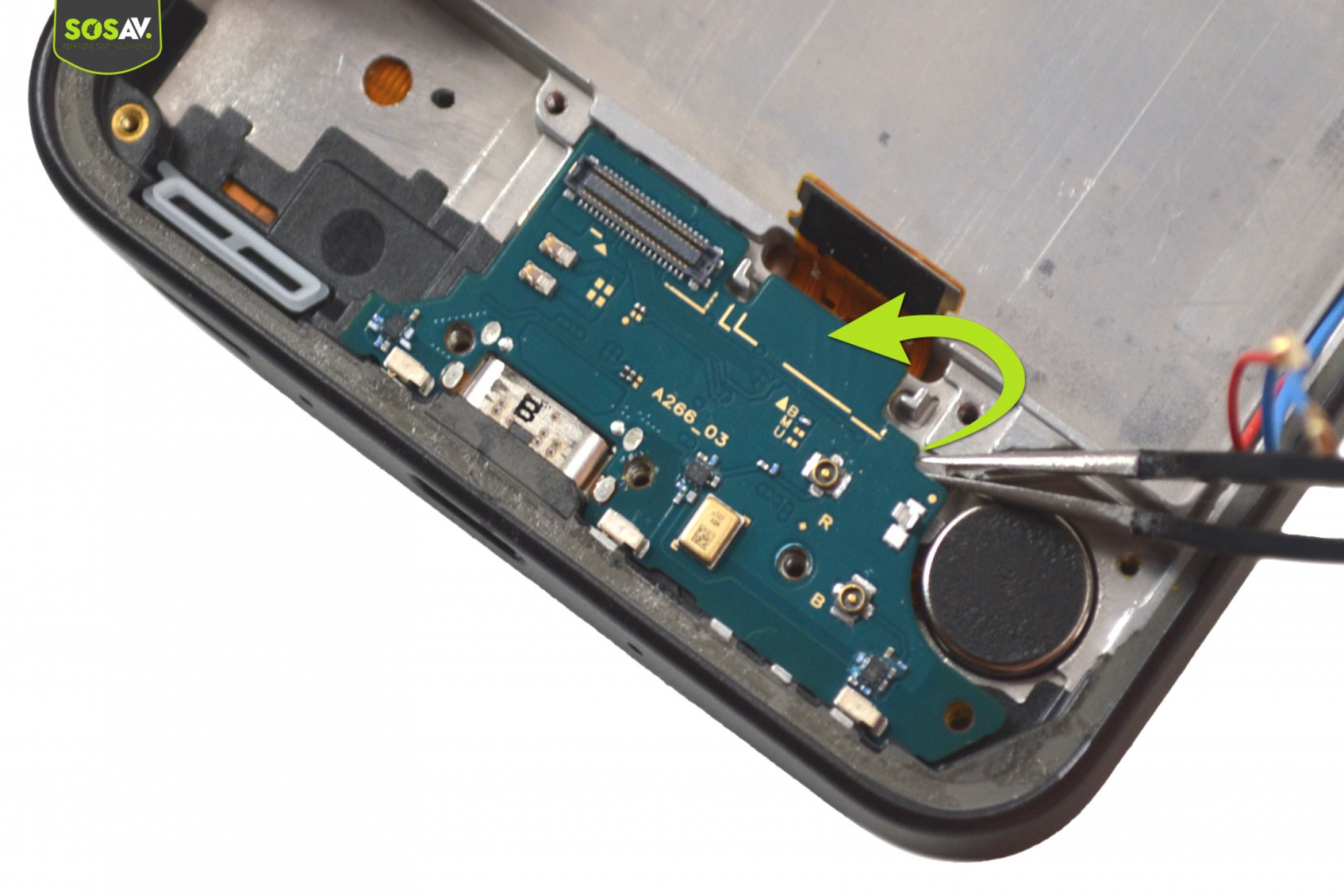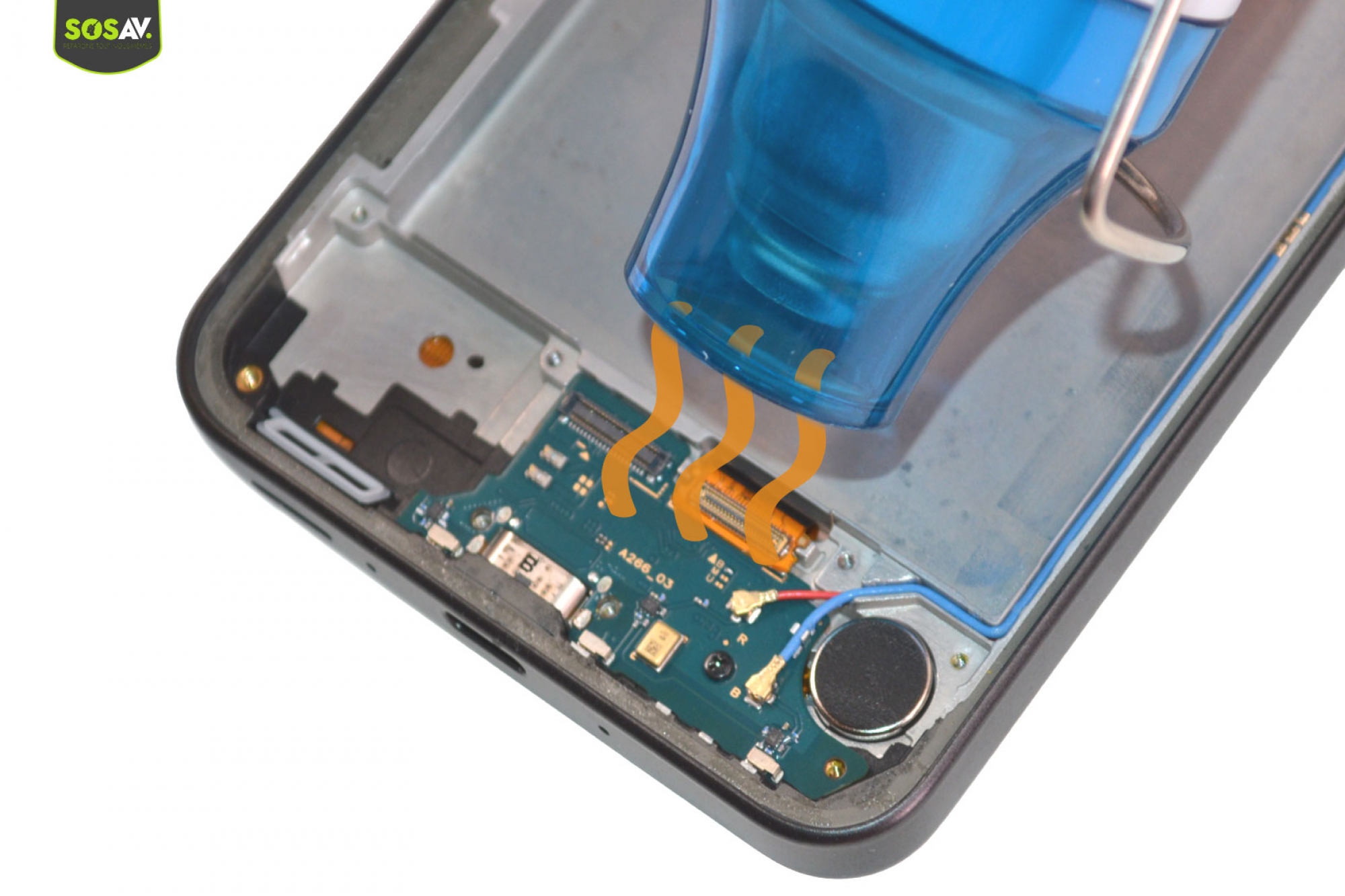 Comme pour l'étape précédente, utilisez de nouveau l'outil pour chauffer le vibreur cette fois-ci. Introduisez le pointe de la pince sous le composant pour le décoller du châssis.