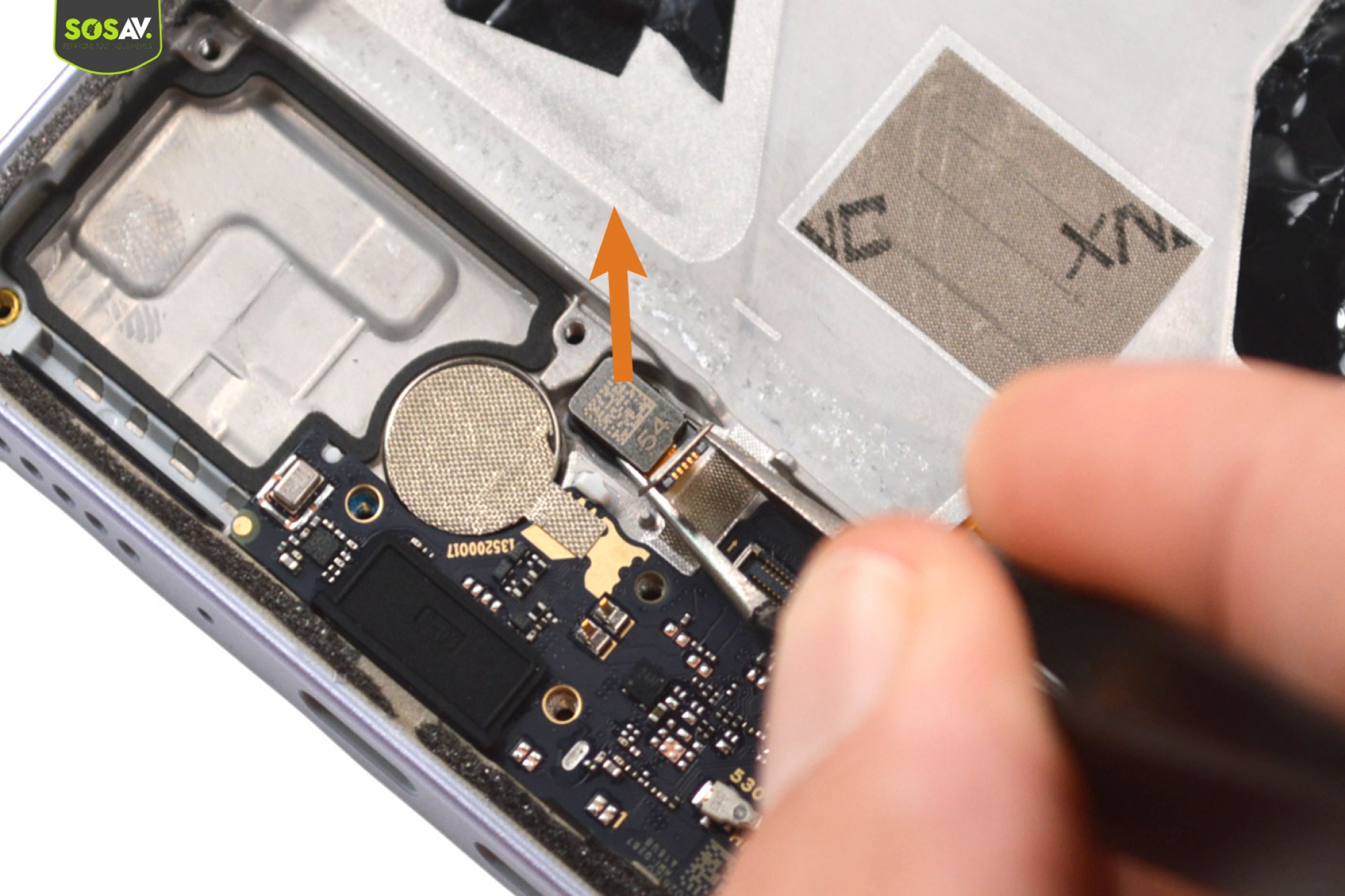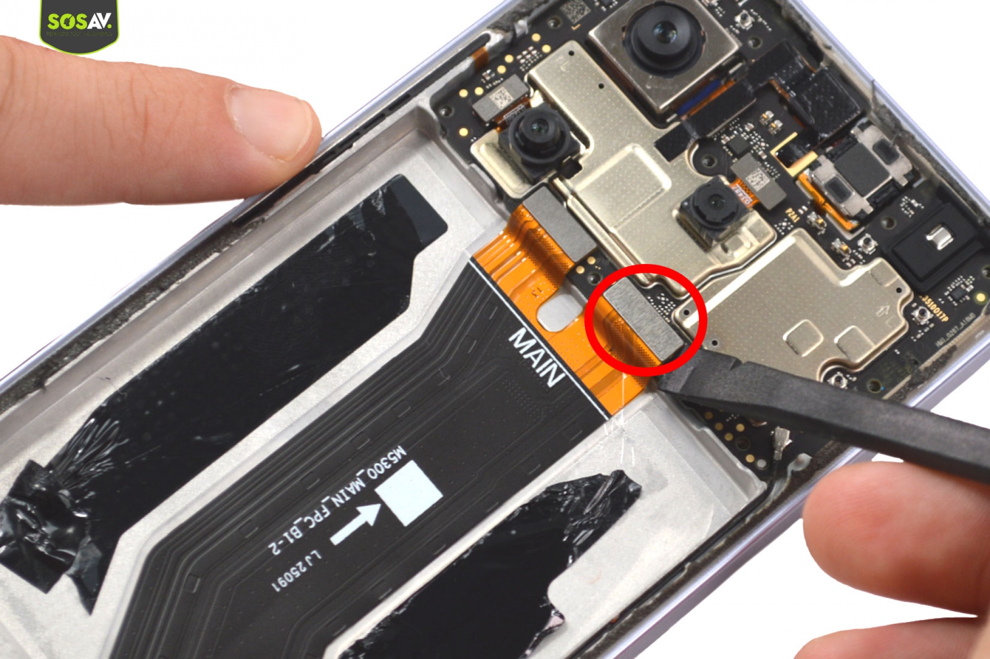 Glissez la pointe de la pincette sous le support pour le déclipser et déconnectez la batterie.